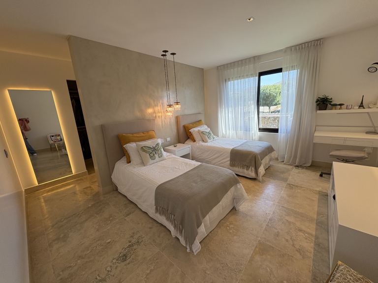 El dormitorio principal está distribuido con un escritorio